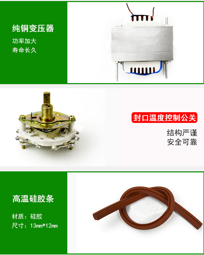 - 封口部件:主要包括封口模具,其形狀和材質(zhì)會(huì)因封口類型和包裝材料的不同而有所差異。對(duì)于普通的塑料薄膜封口,模具通常是平面的,材質(zhì)多為耐高溫的金屬,如不銹鋼。這樣的設(shè)計(jì)可以保證在加熱和壓力作用下,使包裝材料很好地融合在一起。