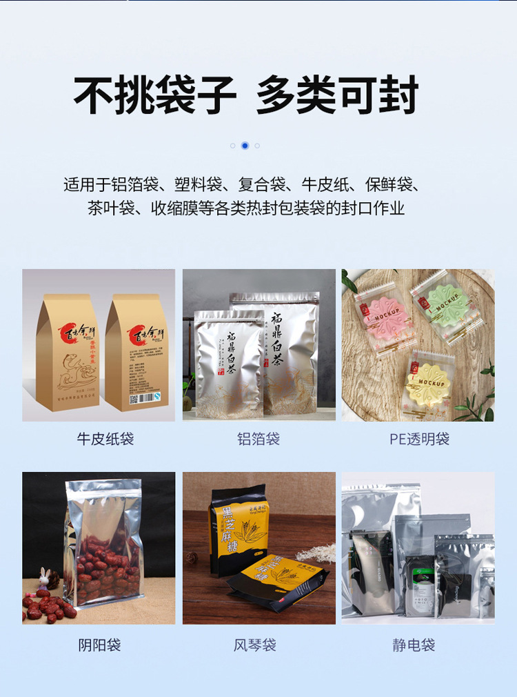 - 適用性廣:可以用于各種材質(zhì)的包裝袋,如塑料薄膜袋(包括聚乙烯、聚丙烯等)、復(fù)合薄膜袋、鋁箔袋等。而且能夠適應(yīng)不同尺寸的包裝袋,只要在機(jī)器規(guī)定的尺寸范圍內(nèi),都可以進(jìn)行有效的封口。
