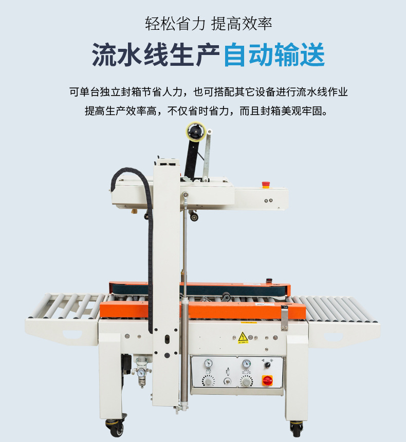 - 啟動(dòng)封箱機(jī):開(kāi)啟封箱機(jī)的電源開(kāi)關(guān),啟動(dòng)輸送帶和封箱裝置。輸送帶會(huì)帶動(dòng)紙箱向前移動(dòng),當(dāng)紙箱到達(dá)封箱位置時(shí),封箱機(jī)的膠帶分配器會(huì)自動(dòng)將膠帶粘貼在紙箱的封口處,并通過(guò)壓合裝置將膠帶壓合牢固,完成封箱操作。