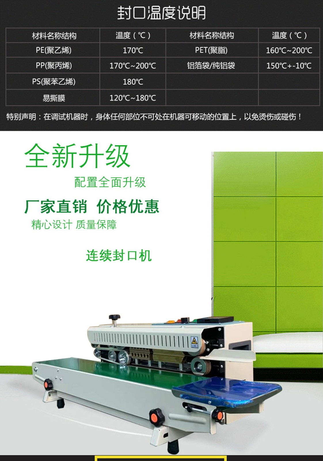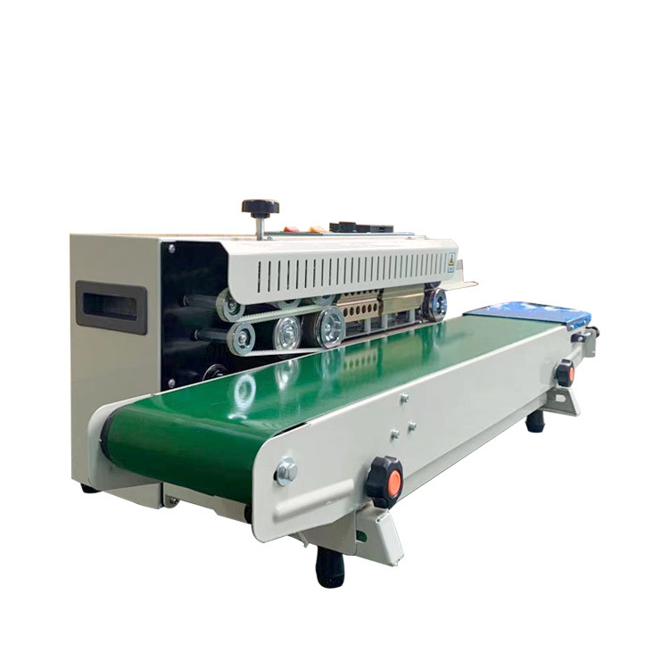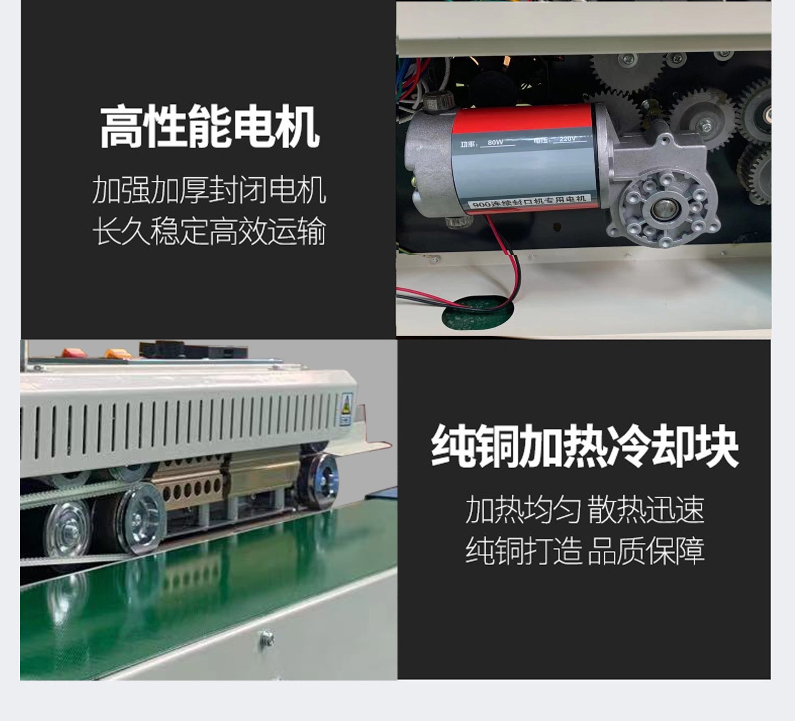 工作原理:連續(xù)封口機采用熱壓封口技術(shù),接通電源后,機器的加熱元件將上下加熱塊加熱,當包裝袋放入封口帶間時,袋子受熱軟化,經(jīng)壓輪擠壓使塑料薄膜的分子相互滲透、粘合,再輸送至冷卻塊之間定型,從而實現(xiàn)連續(xù)封口。