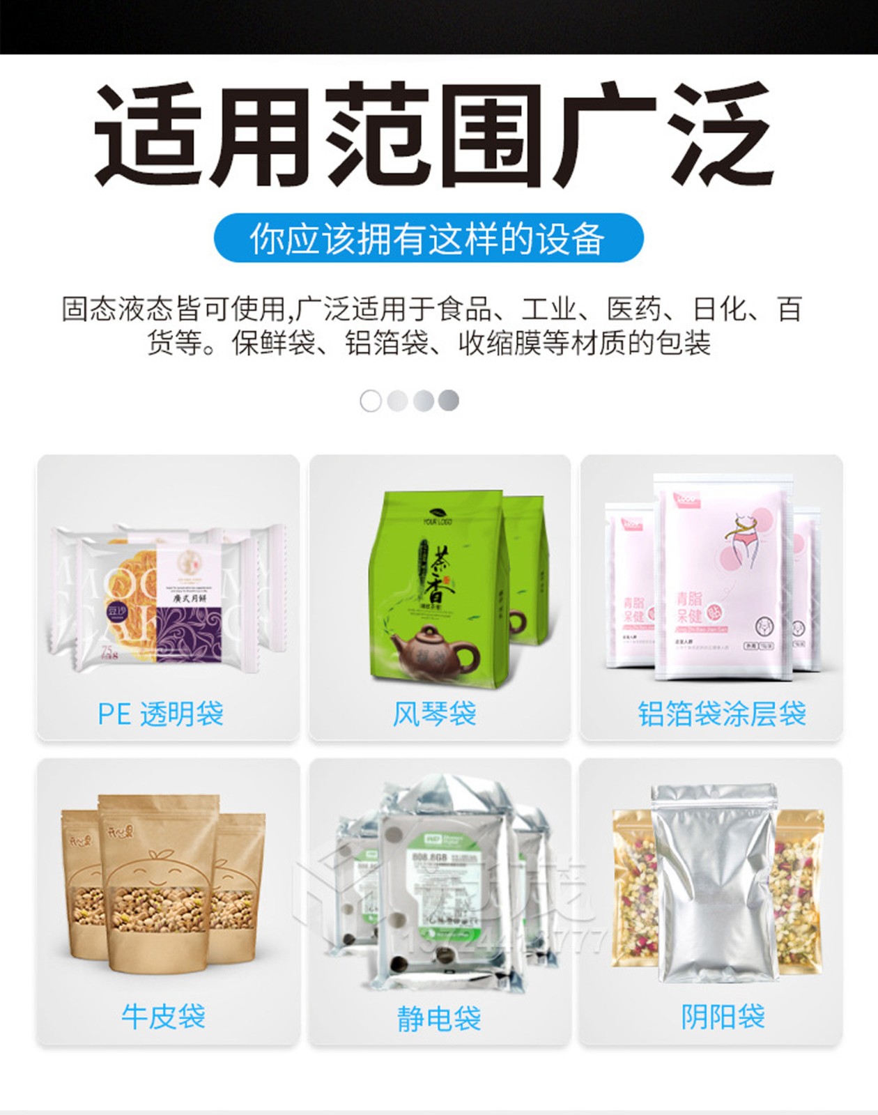 食品行業(yè):用于袋裝零食、咖啡、調(diào)味品、堅果、干果、冷凍食品等的封口包裝,保證食品的新鮮度和衛(wèi)生安全。