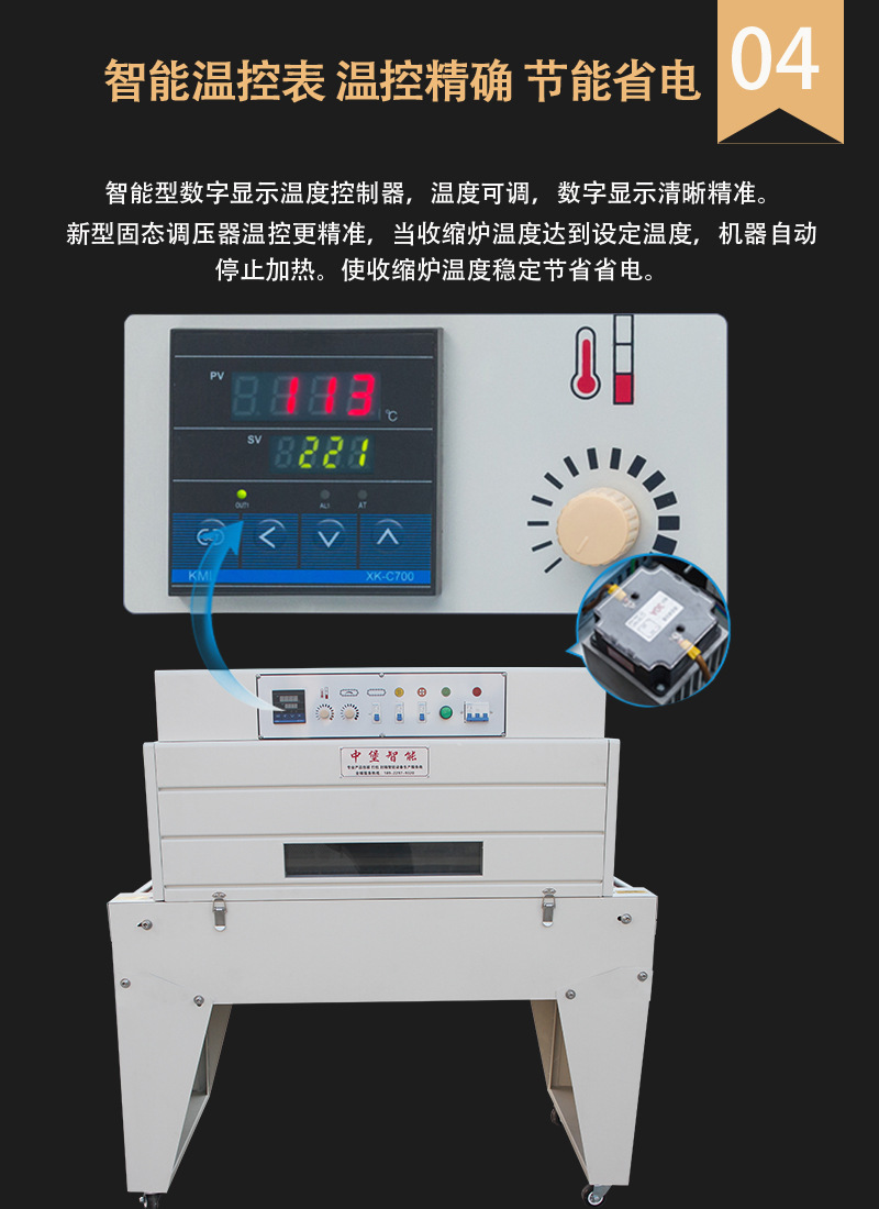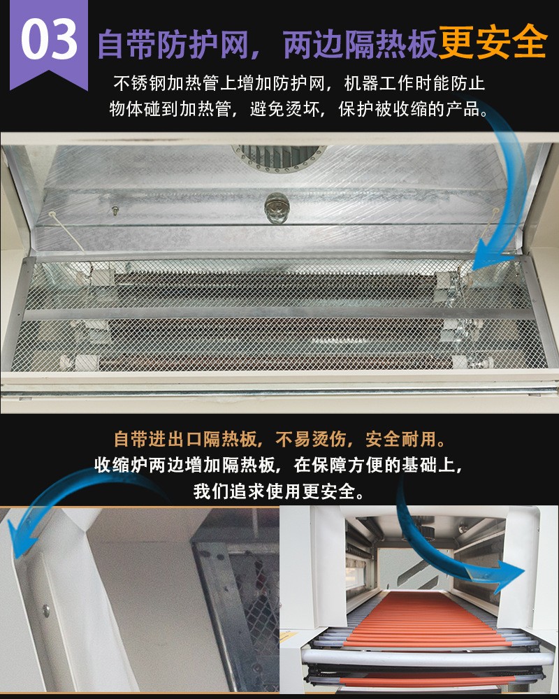 工作時,產品放置在鏈條上,隨著鏈條的移動進入加熱區(qū)域。加熱區(qū)域產生高溫,使包裹產品的熱收縮膜受熱收縮,從而緊密貼合在產品表面,達到包裝的目的。