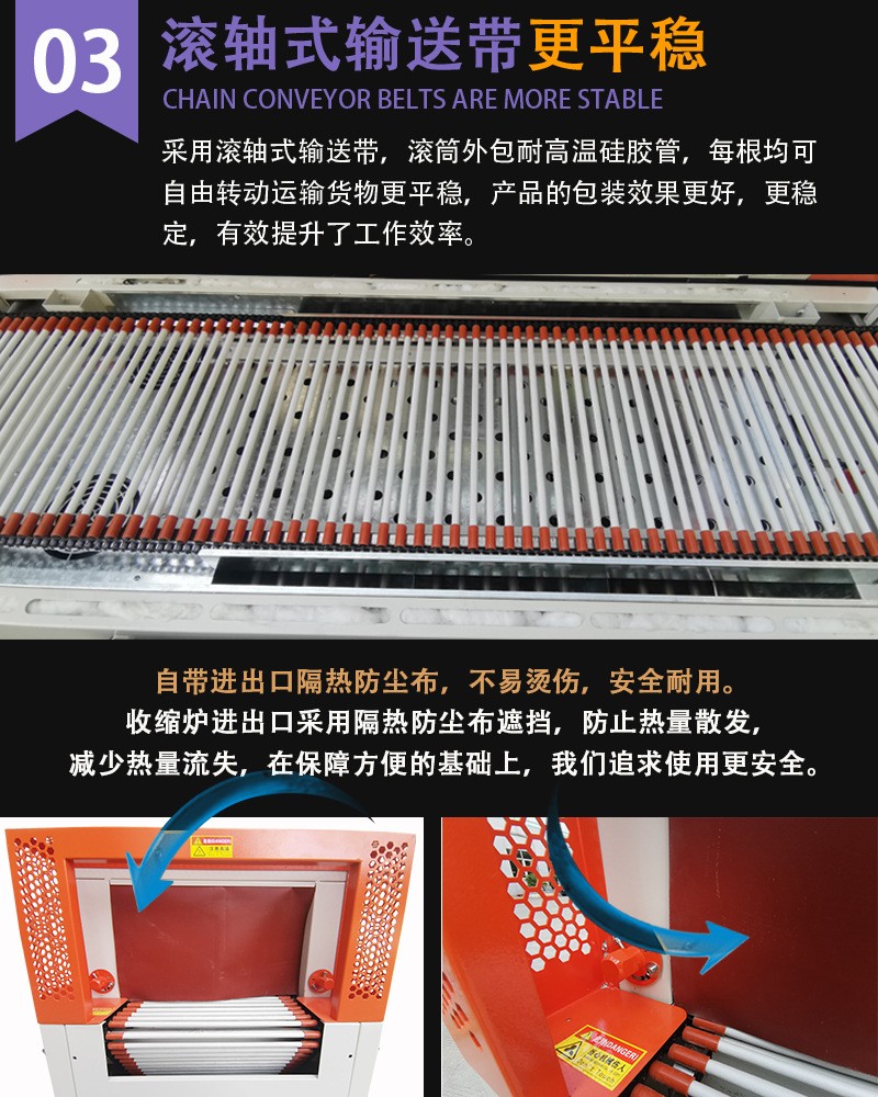 • 熱收縮機(jī)配備了多種安全保護(hù)裝置,確保操作人員的安全。例如,設(shè)備設(shè)有防護(hù)欄、緊急停止按鈕、溫度傳感器等,當(dāng)出現(xiàn)異常情況時(shí),能夠及時(shí)停止設(shè)備運(yùn)行,避免事故的發(fā)生。