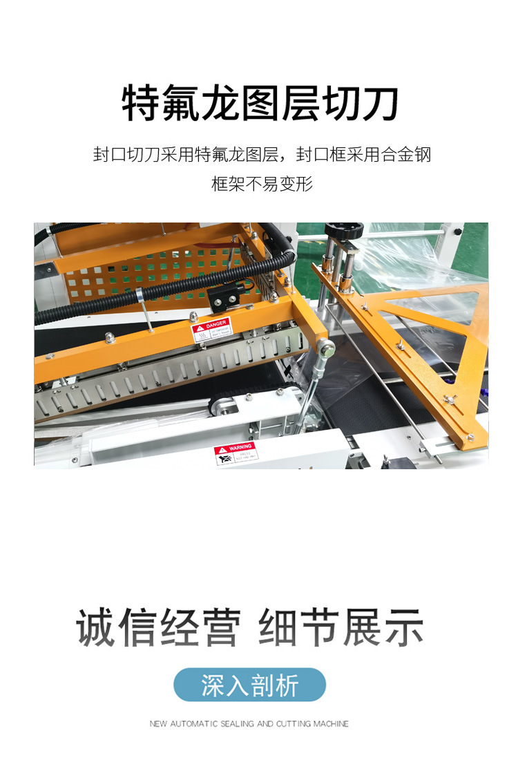 • 封刀采用特殊材料和涂層,如美國杜邦特弗龍涂層抗粘耐高溫鋁合金刀,封口不會開裂,不會焦化,不冒煙,零污染,且封切刀帶有自動保護功能,有效防止誤切包裝物。