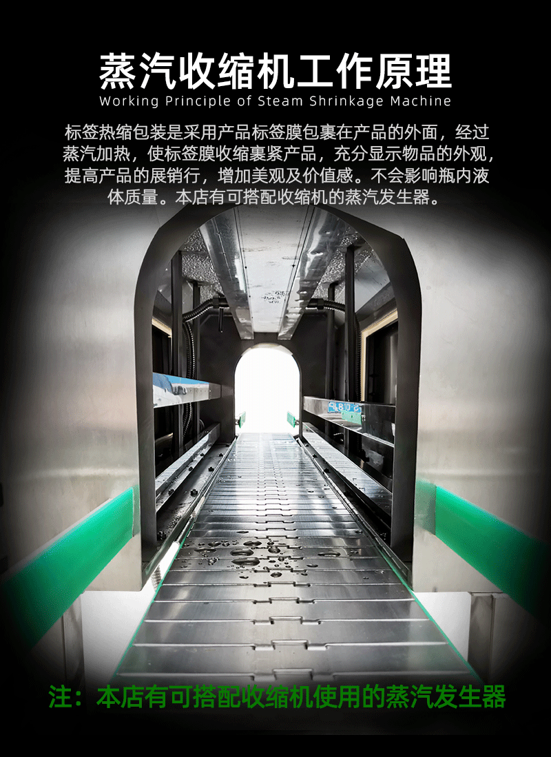 • 工作原理:通過蒸汽發(fā)生器產(chǎn)生高溫蒸汽,將蒸汽輸送到收縮腔室。待包裝的產(chǎn)品事先套上收縮膜,然后進入收縮腔室,蒸汽均勻地作用于收縮膜,使其受熱迅速收縮并貼合產(chǎn)品表面,達到緊致包裹產(chǎn)品的目的 4