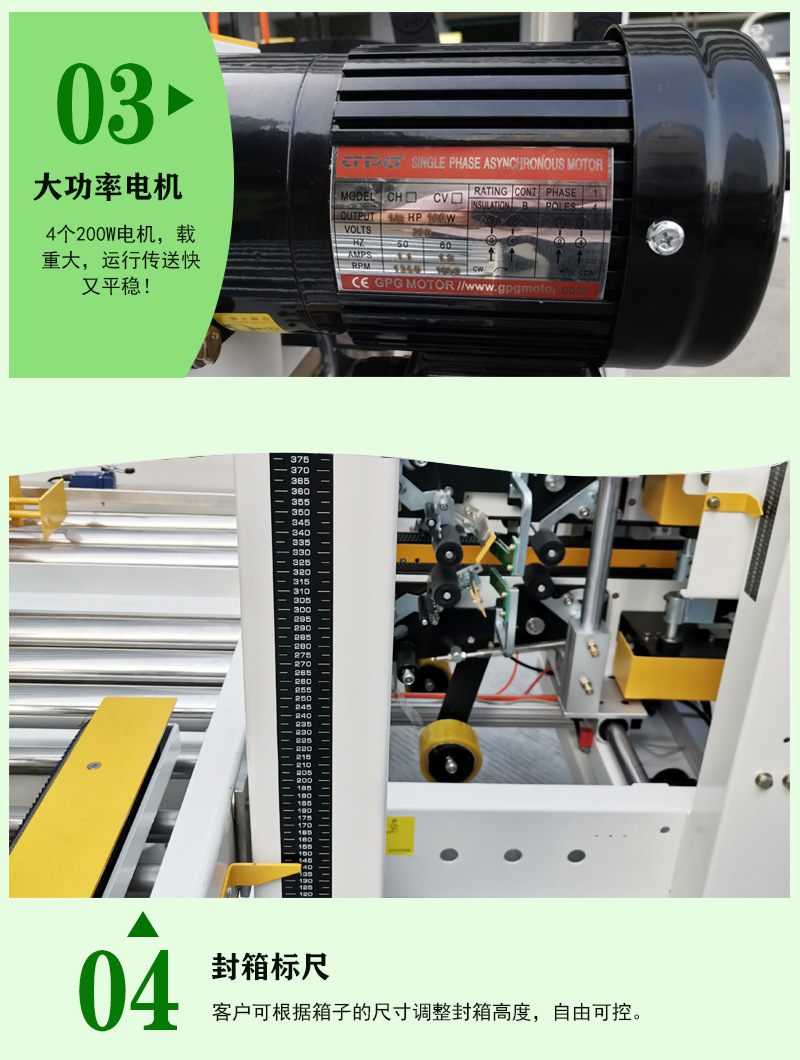 • 高效性:能夠快速、準確地完成封箱操作,大大提高了包裝效率,尤其適用于大規(guī)模的生產(chǎn)包裝作業(yè)。