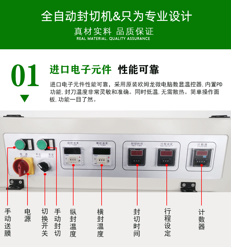 - 負責對整個全自動封切機的運行進行全面控制,包括啟動、停止、調節(jié)輸送帶速度、設定封切溫度、控制薄膜張力等操作。操作人員可以通過控制面板方便地對各項參數(shù)進行設置和調整,同時,一些先進的控制系統(tǒng)還具備故障診斷和報警功能,當設備出現(xiàn)異常情況時,能及時提醒操作人員進行處理,保障設備的正常運行。