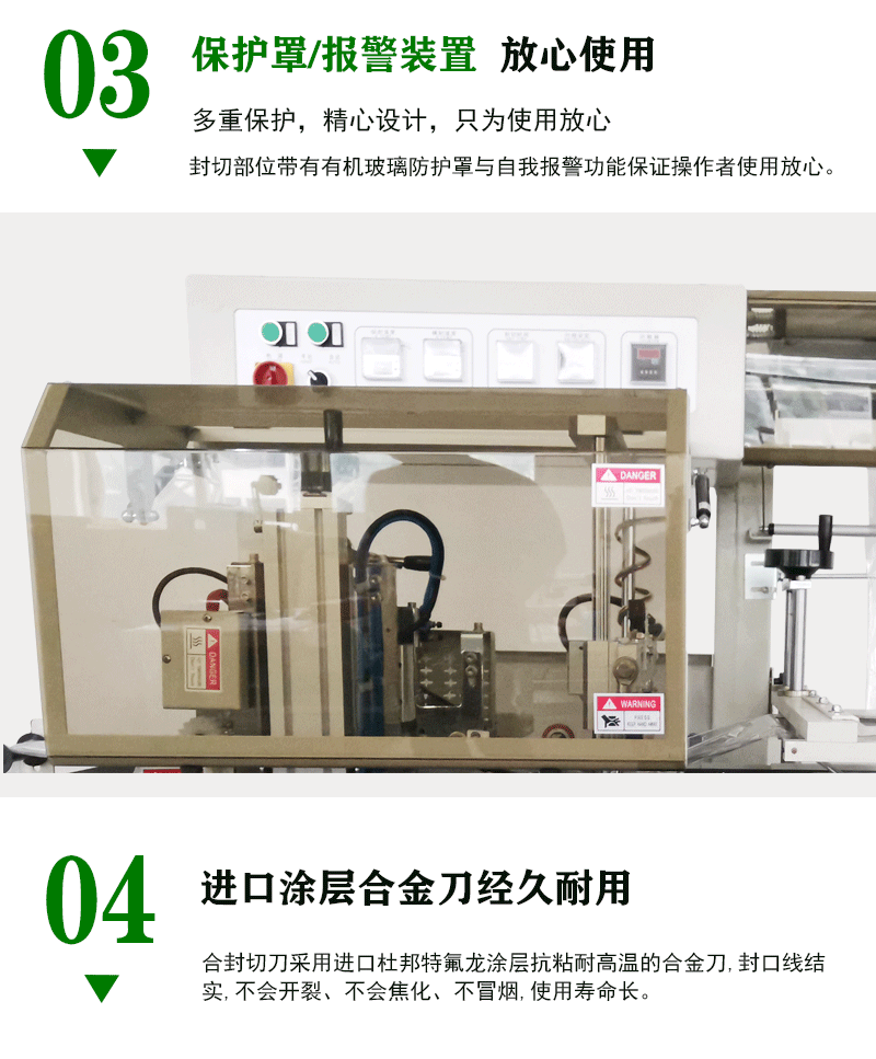 - 在物品被薄膜包裹后,封切裝置會立即啟動。封切裝置一般采用橫向(水平方向)或縱向(垂直方向)的封切方式,對薄膜的封口部位進行加熱,使其達到適宜的溫度,然后利用壓力裝置施加一定壓力,使加熱后的薄膜相互粘結融合,完成封口動作。