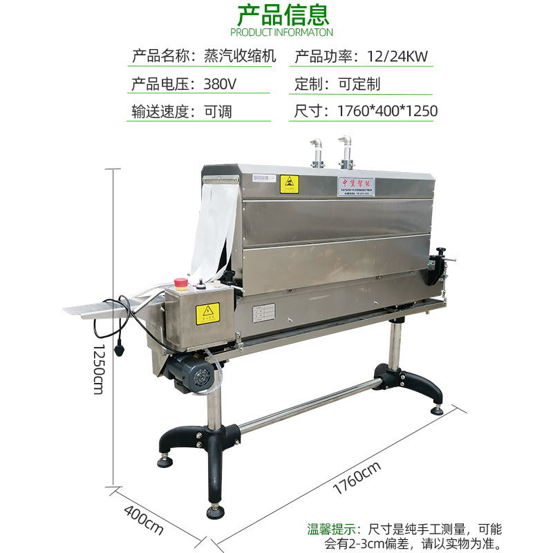 - 要根據(jù)產(chǎn)品的最大尺寸來選擇合適的收縮通道尺寸。如果產(chǎn)品尺寸較大,就需要一個(gè)寬敞的收縮通道,以確保產(chǎn)品能夠順利通過,并且薄膜能夠充分收縮。同時(shí),包裝速度也是一個(gè)重要因素。如果企業(yè)的生產(chǎn)速度快,需要選擇具有較高輸送速度和快速蒸汽加熱能力的蒸汽收縮機(jī),以滿足生產(chǎn)需求。