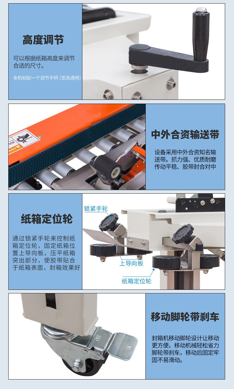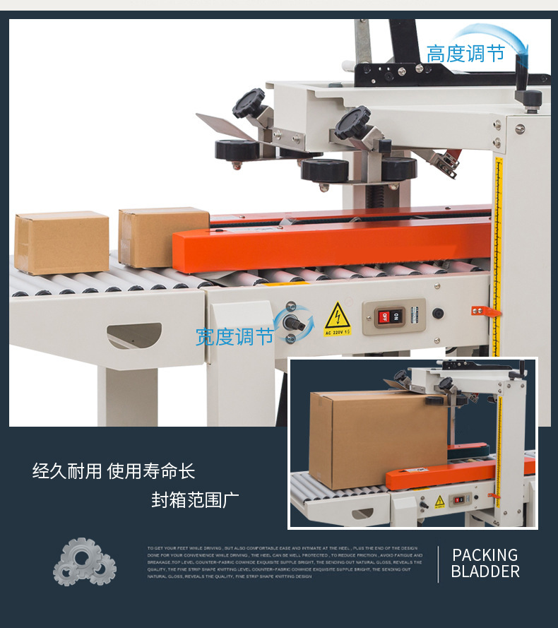 - 有膠帶支架、膠帶切割裝置和膠帶粘貼裝置等部分。膠帶支架用于放置膠帶卷,膠帶切割裝置能夠準(zhǔn)確地將膠帶切斷,避免膠帶過長或過短影響封箱效果。膠帶粘貼裝置則通過壓力滾輪等結(jié)構(gòu)將膠帶粘貼在紙箱上,并且可以調(diào)整粘貼的壓力,適應(yīng)不同厚度的紙箱。