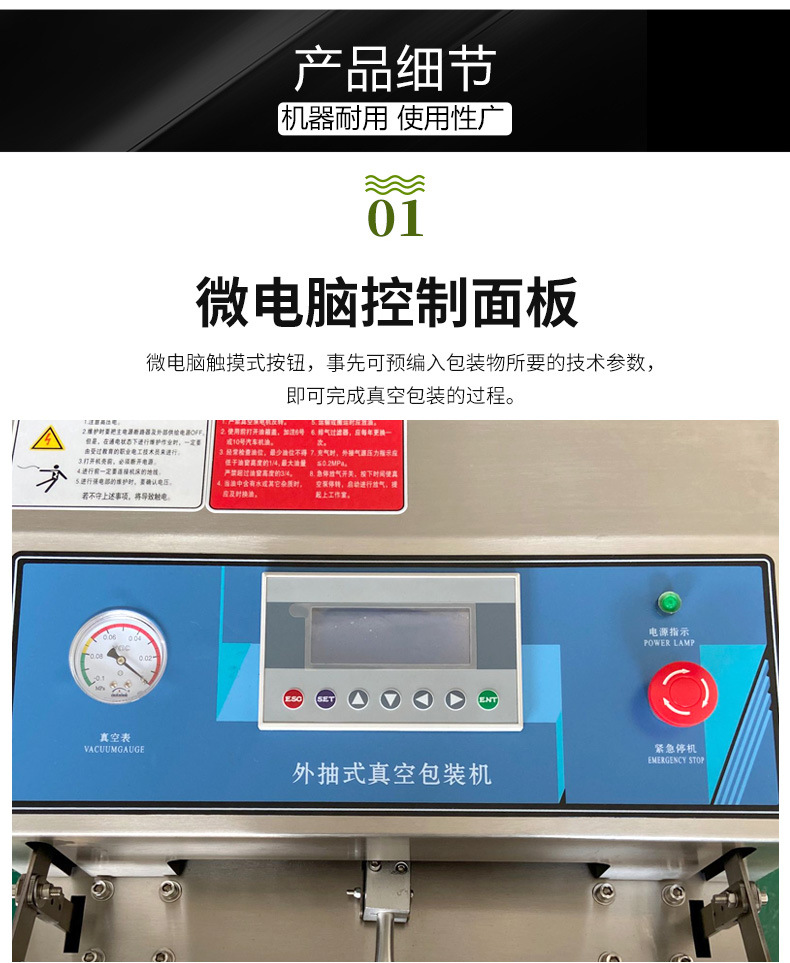 相較于單式內抽真空包裝機,氣動外抽真空包裝機優(yōu)勢顯著。在工作方式上,外抽式無需將產品放入真空室,直接在外部對包裝袋抽氣,可避免產品受真空室尺寸限制,輕松包裝大型或形狀特殊產品。在包裝效率方面,外抽式抽氣速度快,像食品外賣行業(yè),能快速完成餐食包裝,適應快節(jié)奏生產需求,而內抽式因真空室需密封、抽氣、恢復常壓等步驟,流程相對耗時