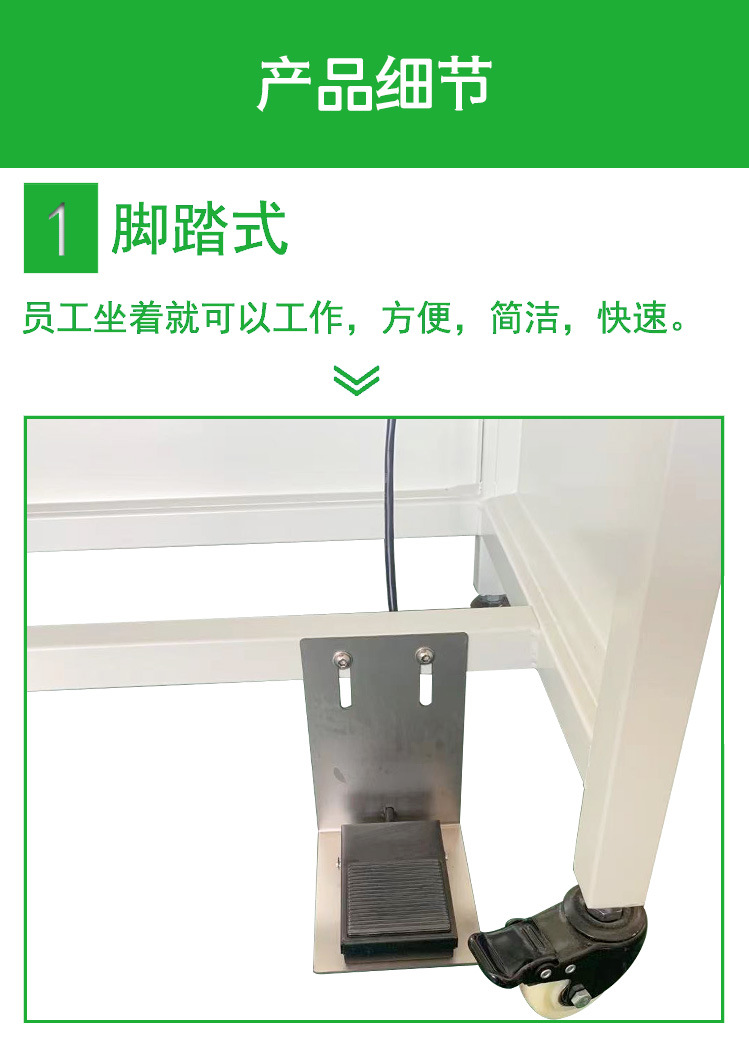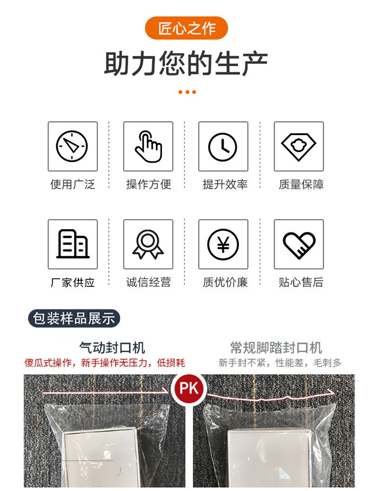 機(jī)器采用的是不銹鋼材料制成,利用壓縮空氣作為動(dòng)力,封口的壓力可以進(jìn)行調(diào)試,根據(jù)產(chǎn)品的不同選擇合適的壓力指數(shù)。設(shè)備穩(wěn)定可靠,可以手動(dòng)操作也可以腳踏操作,簡(jiǎn)單方便。