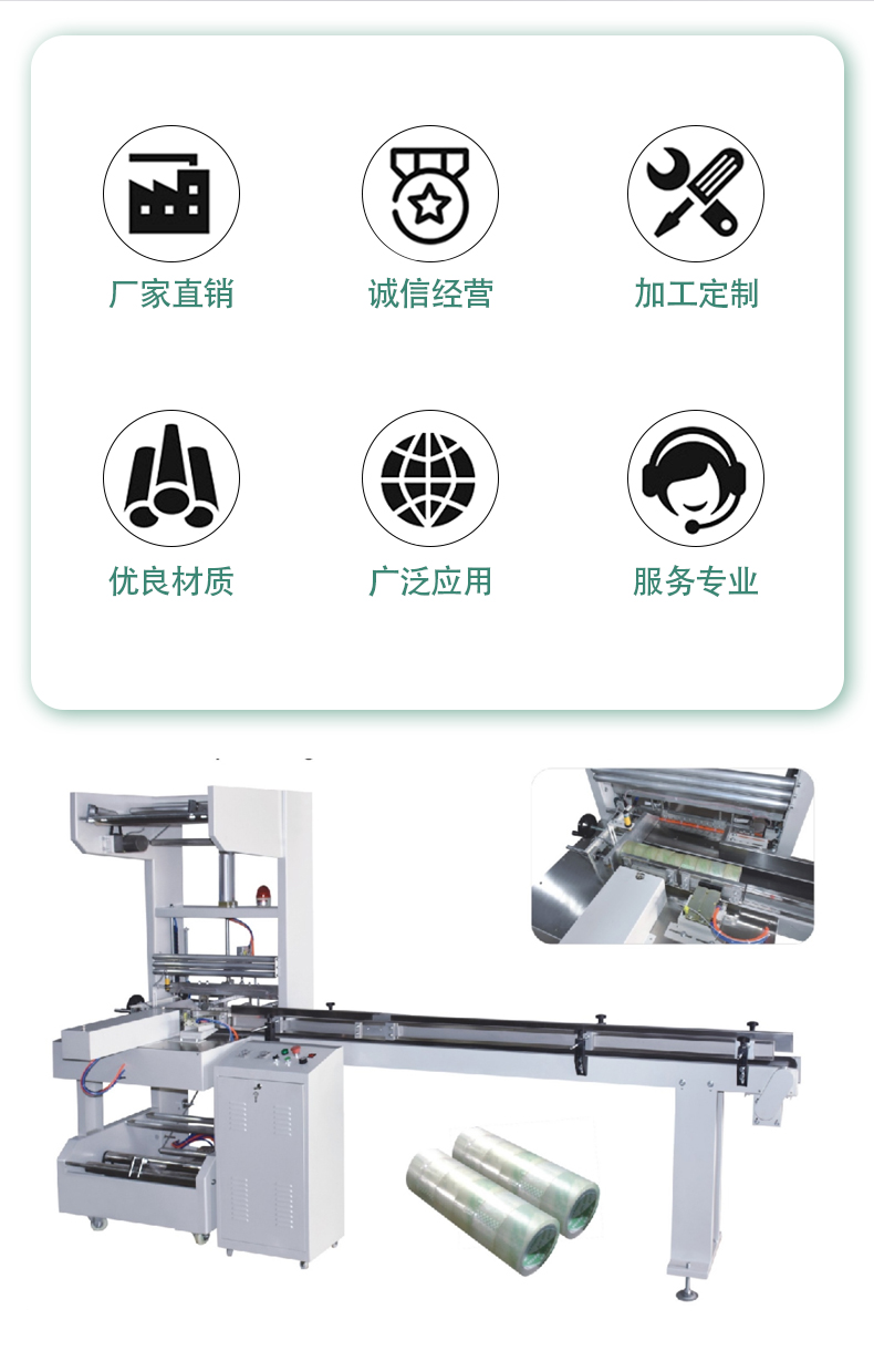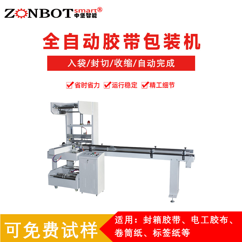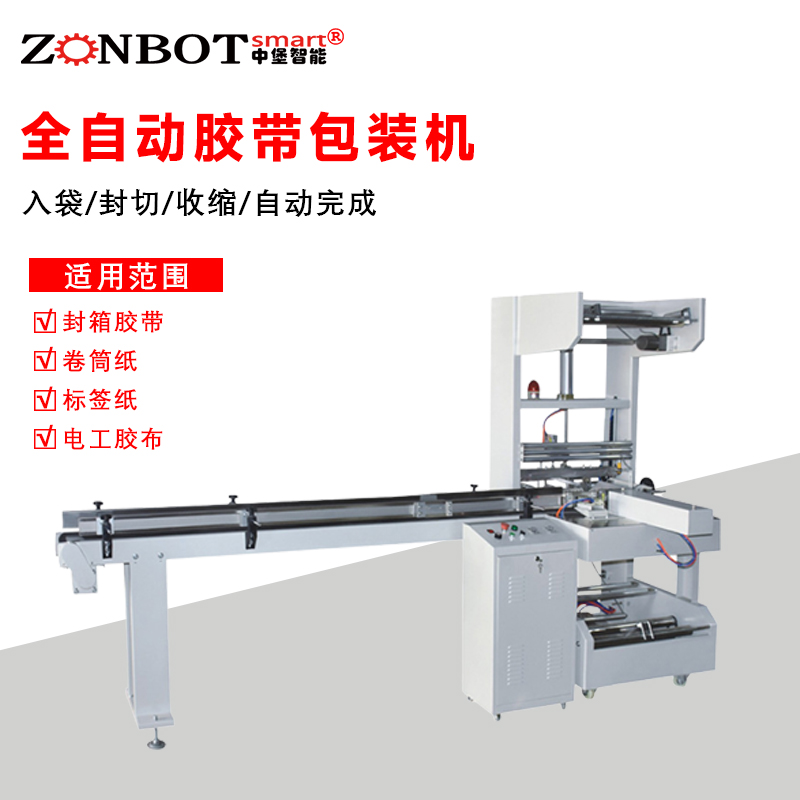 全自動膠帶包裝機是一種高效自動化設(shè)備,用于膠帶產(chǎn)品的包裝。它能自動完成多道包裝工序,將膠帶卷包裝成符合市場銷售和運輸要求的成品。這種設(shè)備集成了機械、電氣、氣動等多種技術(shù),通過精確的控制系統(tǒng)協(xié)調(diào)各部分工作,大大提高了膠帶包裝的生產(chǎn)效率和包裝質(zhì)量。 工作流程 進料:首先通過進料裝置將膠帶卷有序地輸送到包裝區(qū)域。進料裝置一般有輸送帶,能夠穩(wěn)定地把膠帶卷按照一定的間距逐個傳送,確保膠帶卷能準確進入下一個包裝環(huán)節(jié)。 裹包:在包裝區(qū)域,包裝材料(通常是塑料薄膜)會被展開并圍繞膠帶卷進行包裹。這一過程是通過機械結(jié)構(gòu)來實