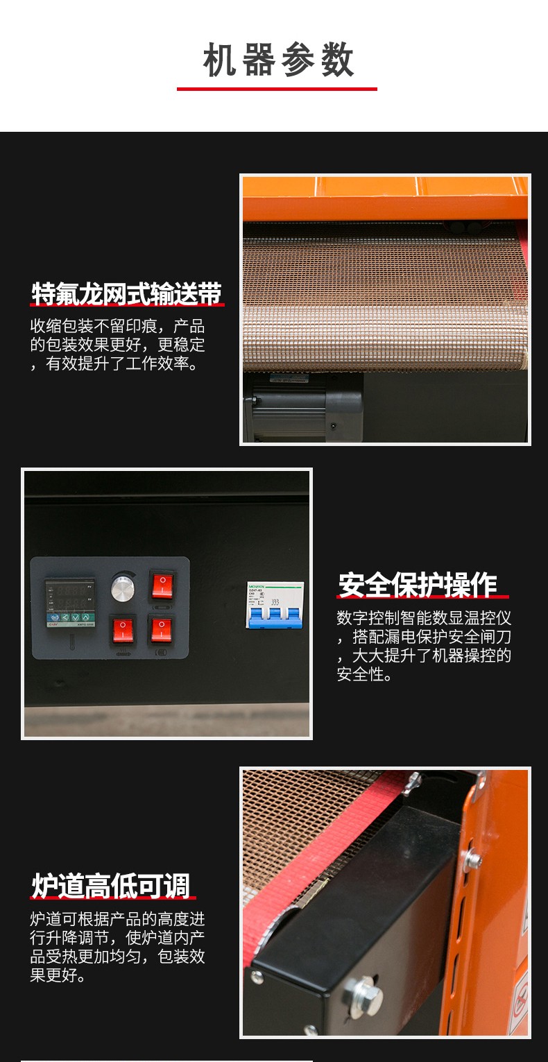 • 收縮溫度范圍:一般為 120 - 200℃。不同的熱收縮薄膜有不同的最佳收縮溫度,在選型時要考慮機器的溫度范圍是否能夠滿足所使用薄膜的要求。例如,PVC 薄膜的收縮溫度一般在 140 - 160℃,POF 薄膜的收縮溫度約為 160 - 180℃。