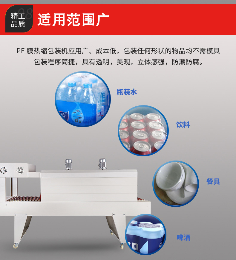 適用范圍廣:可以用于包裝各種形狀和尺寸的產(chǎn)品,無論是規(guī)則的圓柱體、長方體,還是不規(guī)則的產(chǎn)品,只要選擇合適的 PE 薄膜,都可以用這種機(jī)器進(jìn)行包裝。而且它可以與其他包裝設(shè)備和生產(chǎn)線集成,實(shí)現(xiàn)自動(dòng)化包裝,提高生產(chǎn)效率。