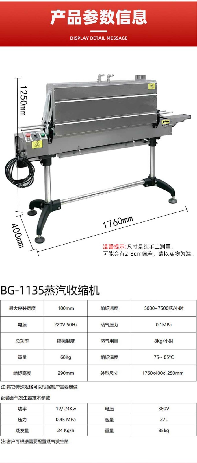 - 高效收縮:能快速產(chǎn)生大量蒸汽,使包裝膜迅速收縮貼合產(chǎn)品,可提高生產(chǎn)效率。