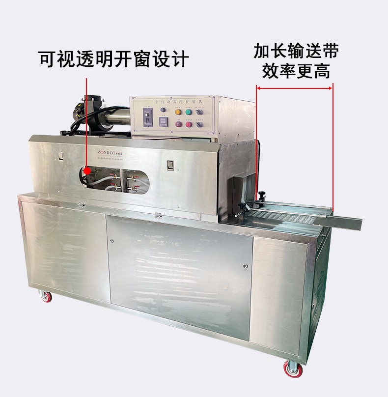蒸汽收縮機利用蒸汽獨有的恒溫而且溫度擴散均勻的特性來工作,以達到普通電熱紅外加熱收縮機不可比擬的效果。設備采用加熱器加熱水而產(chǎn)生蒸汽,不需要另外配備蒸汽鍋爐。主機有主副2個加熱器,可以根據(jù)不同的生產(chǎn)速度來調節(jié)設備功率的大小,輸送帶采用無級調速,輸送速度可以任意調節(jié)。廣泛應用于大桶或小瓶裝礦泉水、純凈水;汽水和茶飲料等食品飲料行業(yè),以及化妝品、洗發(fā)水和五金電子等需要收縮膜包裝的場合使用。